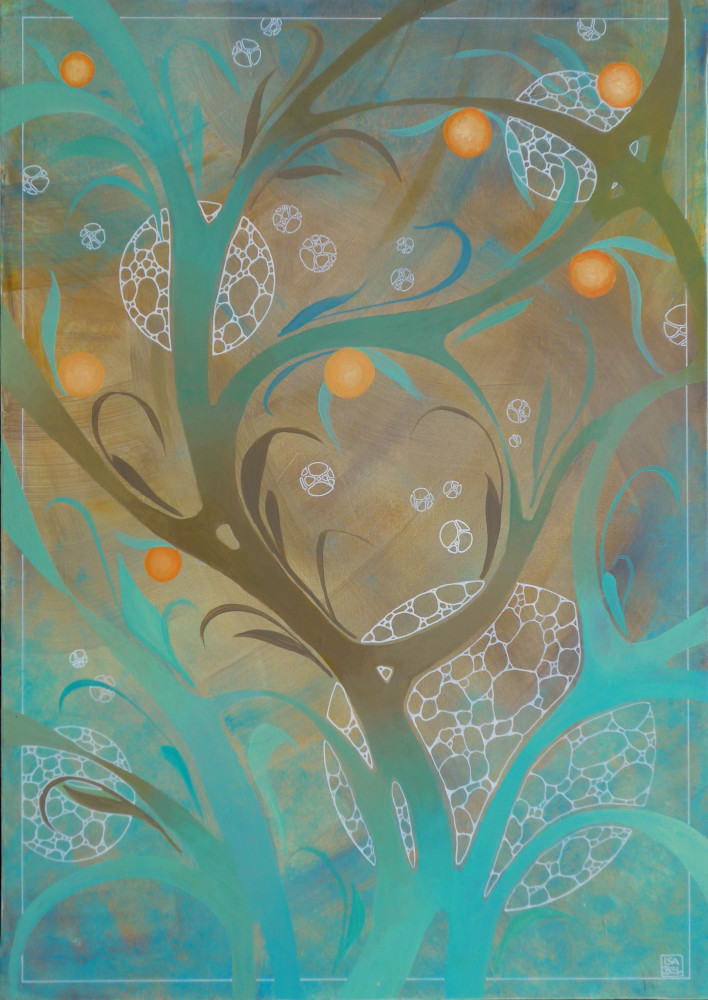 Influencé par l’art nouveau et l’art déco, mon travail intuitif crée par couches successives des mondes colorés où les éléments graphiques qui s’inspirent parfois de la nature se rejoignent, se mélangent pour créer du mouvement et un sentiment de lien et d’interdépendance. La peinture intuitive est une démarche artistique qui consiste à s’ouvrir à son ressenti et à se laisser porter par les éléments qui apparaissent sur la toile ou le papier, sans but ni projet préalable. C’est un mode de création proche de la méditation et cette approche se ressent dans le tableau. Le spectateur peut se laisser porter par la complexité des formes, la vibration des couleurs afin de ressentir lui aussi le bien-être que je ressens lorsque je peins.